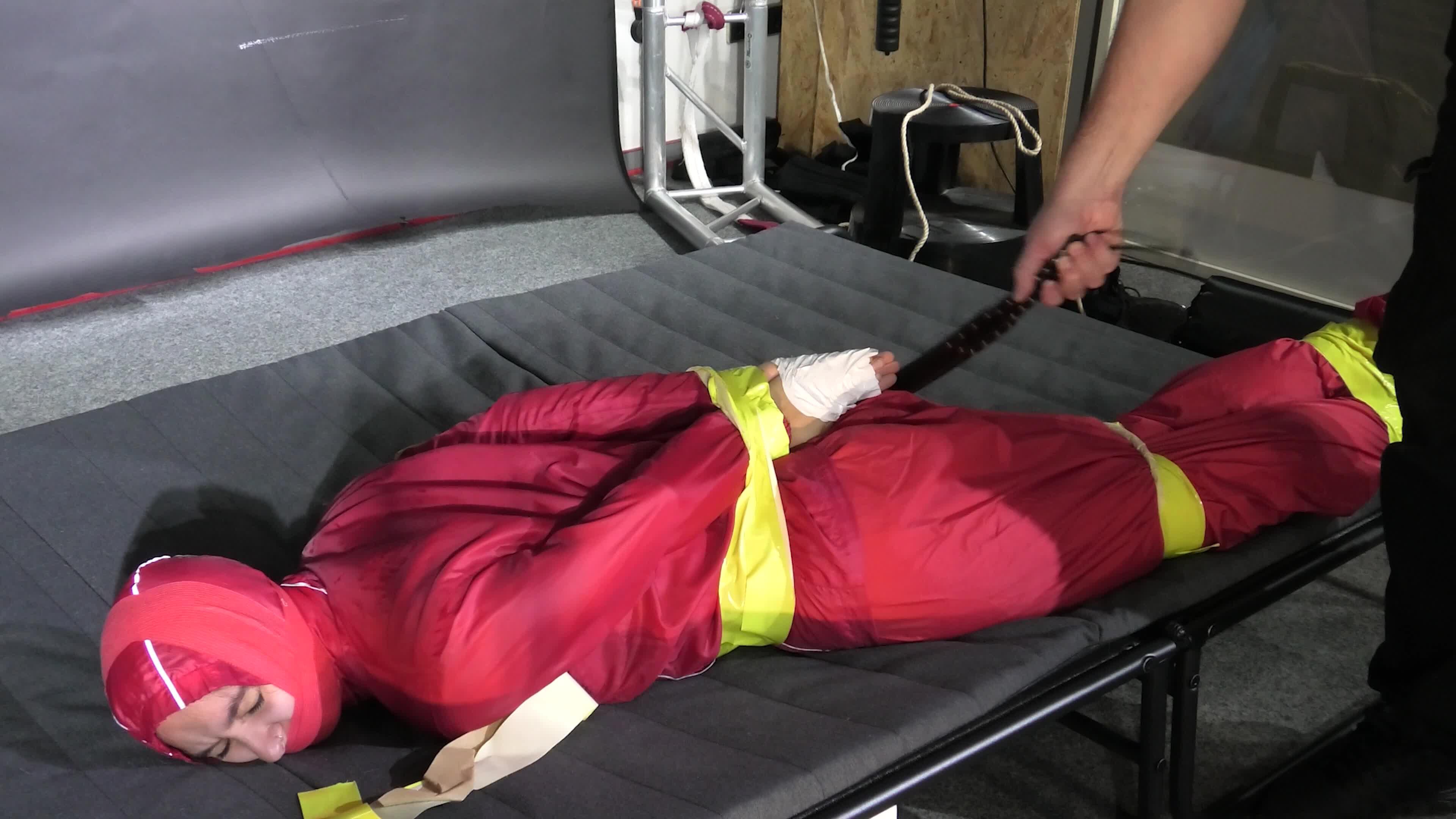 What happens if the Man with the tape is a nice guy? ... The escape challenge is to easy. I learned and will be more acurate and mean next time :). Still a good video in shiny red reainwear. 3